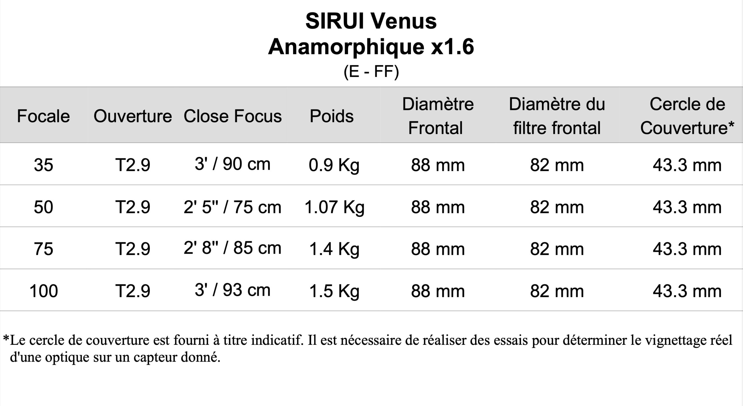 Elles proposent un facteur de compression anamorphique de 1,6x, permettant d’obtenir des ratios d’image d’environ 2.4:1 à 2.8:1 après désanamorphose.