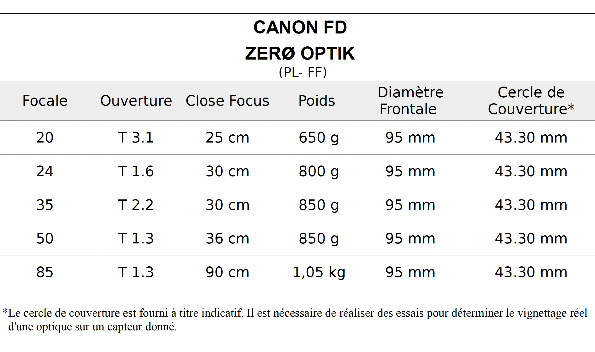 Série de 5 Optiques Canon FD ZERØ OPTIK PL – FF – ø95 mm (20-24-35-50-85)