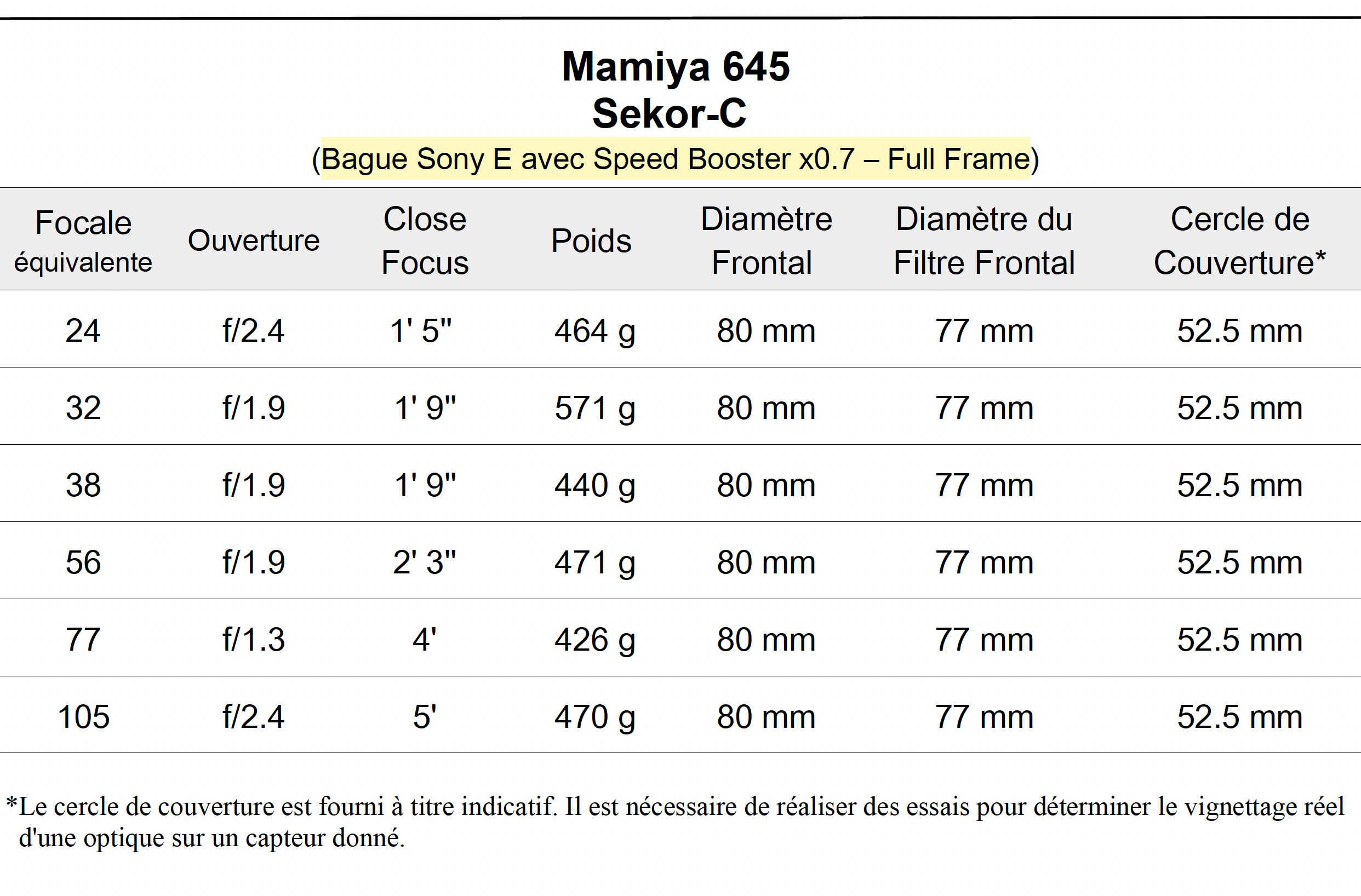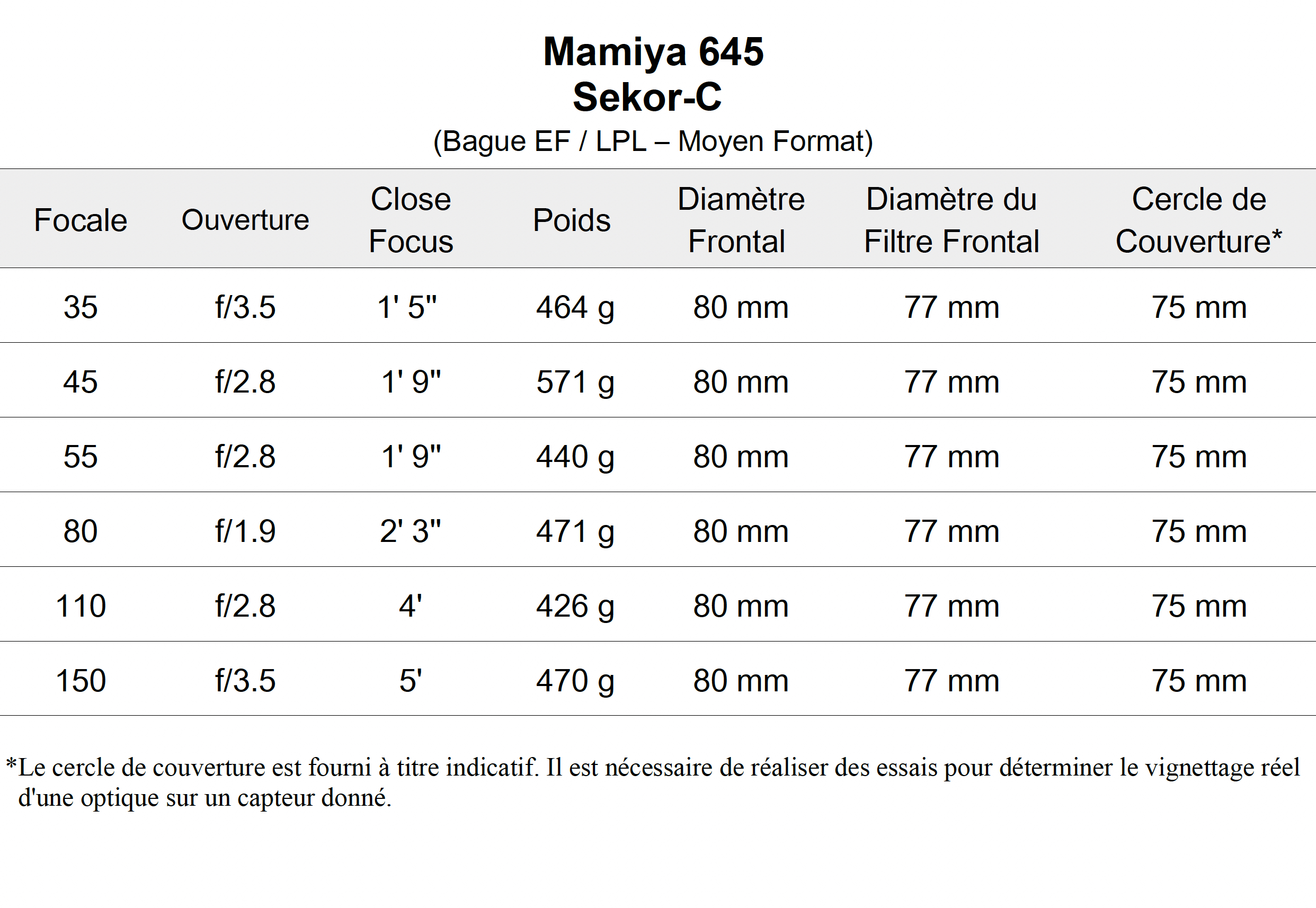 Les optiques Mamiya Sekor-C que nous proposons sont “Cinémodées” avec des bagues de point et d’ouverture en pas 0.8, le diaphragme est “Déclické”, les frontales sont uniformes avec un diamètre externe de 80mm et le diamètre du filtetage frontale de 77mm.